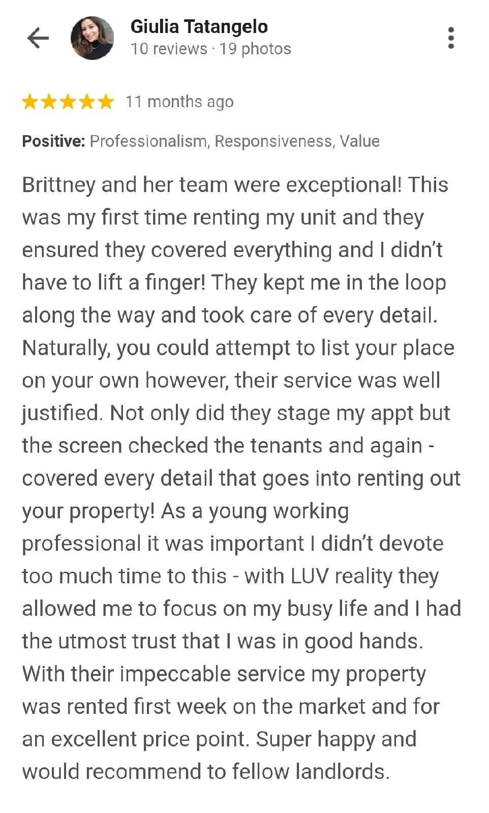 Vera has also worked with many Investor clients, and would help them find suitable tenants for their properties. She would assist Investors in finding the right place based on Toronto's growing community.